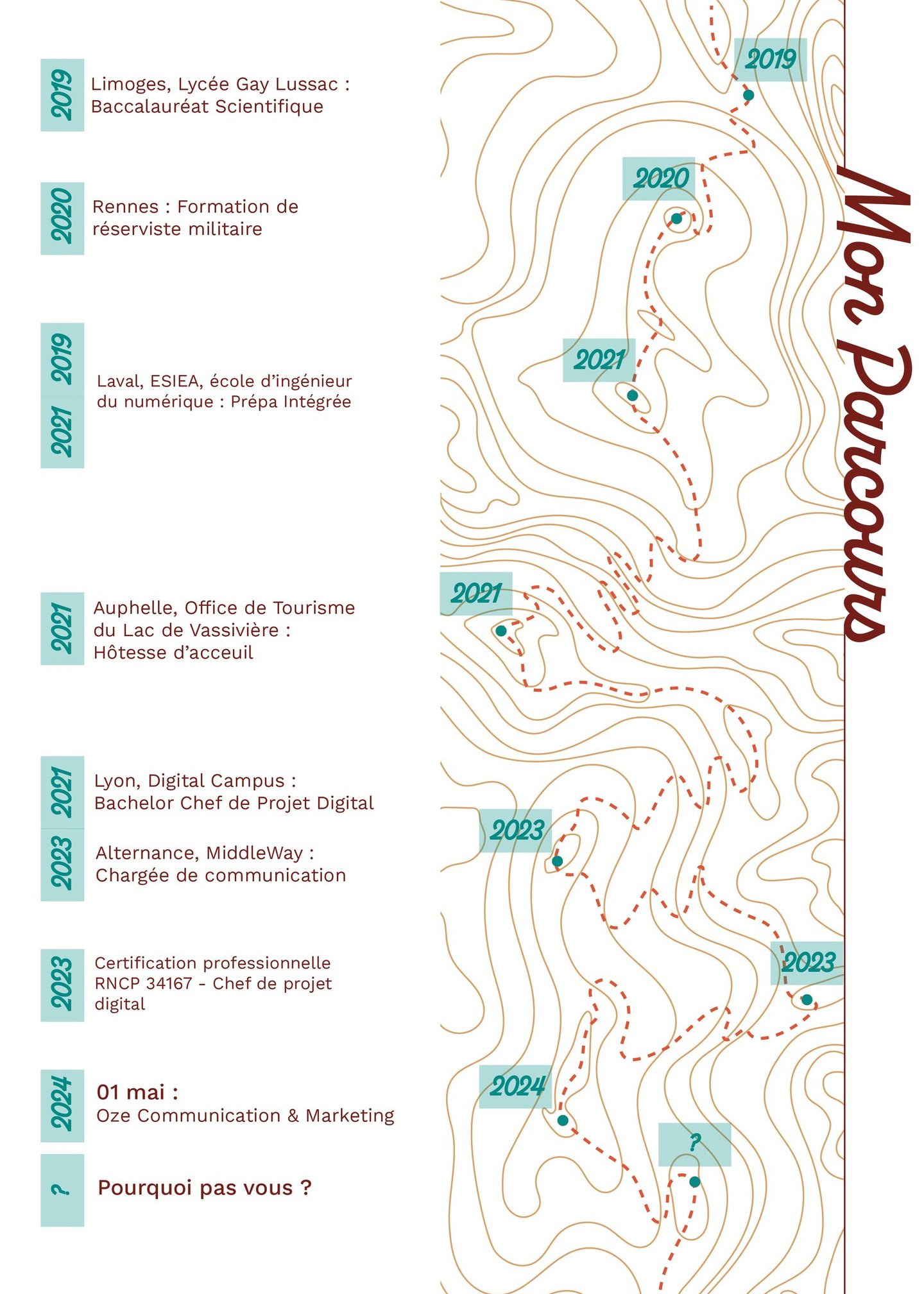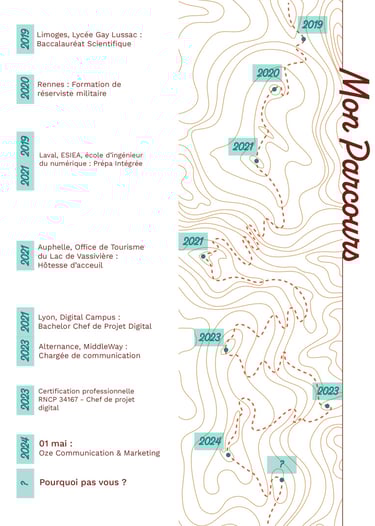 J’ai suivi une prépa intégrée (mathématiques, physique, électronique et informatique) qui est aujourd'hui la source de la plupart de mes compétences techniques. En parallèle, je me suis lancée le défi un peu fou de devenir réserviste militaire, une drôle d’expérience qui m’a appris la rigueur et l’importance de l’organisation. Réorientée vers la communication suite à la crise de la Covid-19, j'ai terminée fièrement major de promotion de mon Bachelor chef de projet digital.