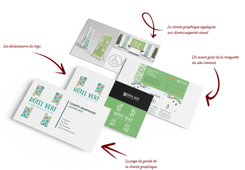 Tout d'abord, il a fallu trouver un nom à cette nouvelle identité : Hôtel Vert, le marché est clairement ciblé et l'objectif est clair, notre ligne de conduite est alors toute tracée ! En découle alors un logo basé sur la lettre H. Au-delà d'être l'initiale du nom de la marque c’est aussi l’initiale d’hydrogène, principal composant de l’eau et du corps humain. Ensuite, nous sommes venus y ajouter une baseline “Le goût de préparer l’avenir” celle-ci faisant écho à la baseline d’Aidoresto “Le goût d’aller plus loin”. Une fois chacune de ces étapes réalisées nous nous sommes lancés sur la création d'une charte graphique et de la maquette du site internet.